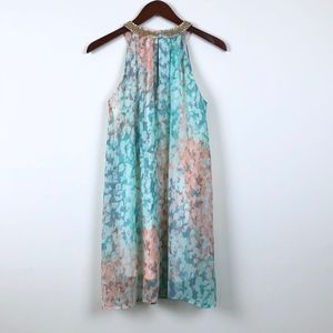 Features: Beaded halter neck, keyhole neckline, turquoise/teal/peach watercolor print, silky bodice, fully lined