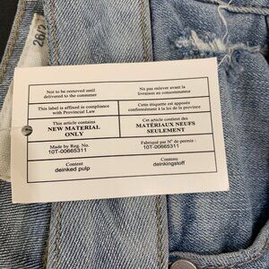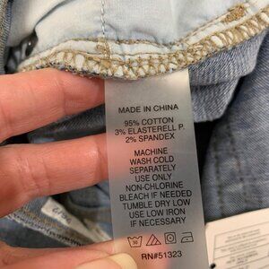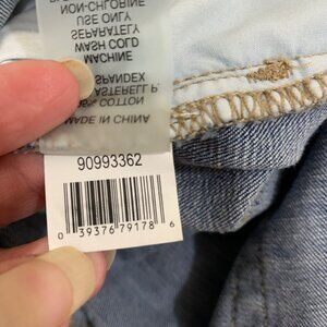 Five pocket design with zip fly and button closure. Distressing features throughout with a contrasting color waistband that’s lighter than the rest of the jeans