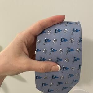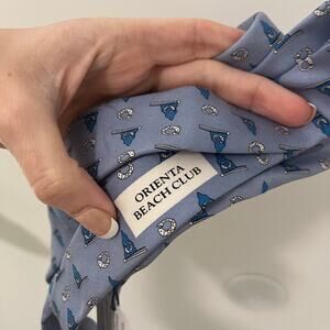 NEW Vineyard Vines Orienta Beach Club Blue Men's Neck Tie. New with tags NWT. Light blue with beach club's graphic throughout. Silk.