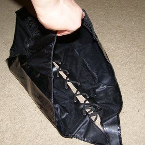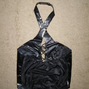 Sexy lace up front, halter neck with velcro closure, vinyl body, nylon stretchy back