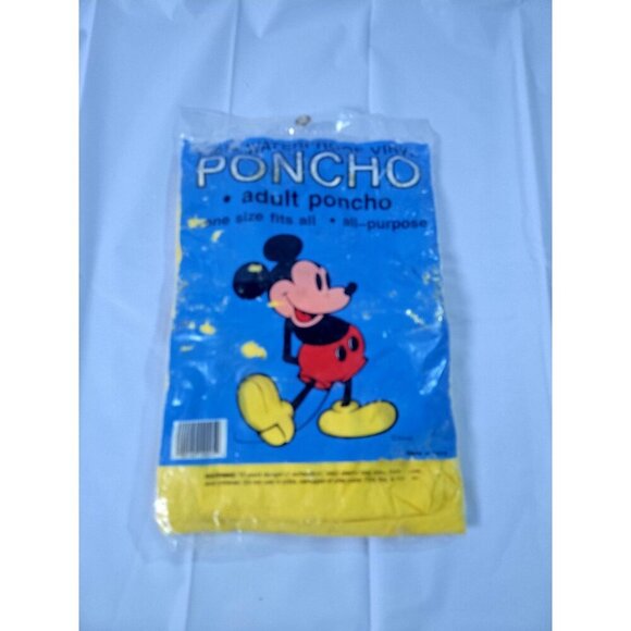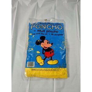 This product is a NEW vintage Disney World Mickey Mouse rain poncho in adult one size fits all. It features a classic yellow color with the iconic Mickey Mouse character. Made in Thailand as part of the Disney franchise, this unisex poncho is suitable for both men and women. Perfect for collectors of Disney memorabilia or fans of Mickey Mouse, this unique item adds a touch of nostalgia and fun to any wardrobe.
