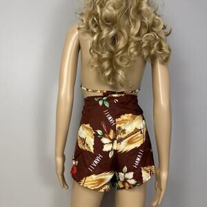 Listed is a vintage Fashioned by Hukilau Fashions Honolulu RN 43220 Hukilau Fashions Hawaiian two-piece set, size Medium, new without tags. Includes a triangle bikini-style halter top and high-waisted wrap shorts, both in a rich brown tropical print featuring hibiscus flowers, island scenes, and "Hawaii" lettering. Style 311 Set.