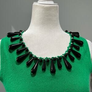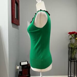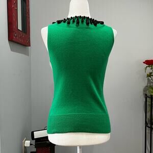 New Gorgeous Vintage Cashmere Emerald Green Exaggerated Statement Bejeweled Scoop Neck Sleeveless Sweater Top by Milly of New York. Black Teardrop and Black and Silver Ball Bead Adornment Sewn at Neck to Create a Necklace Effect. Classic, Tailored, and Fitted. Slight Stretch. Lightly Ribbed Hemline. Great Layering Piece. Size P on Label is Size Small. Please Review Measurements as this is as Vintage Item.