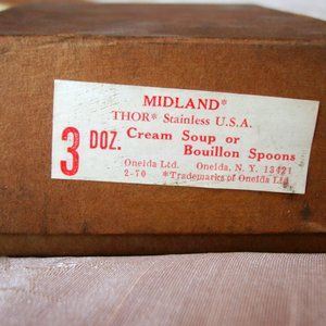A rare find of vintage unused Oneida Thor "Midland" pattern bouillon soup spoons. This is the discontinued version of the Midland pattern.