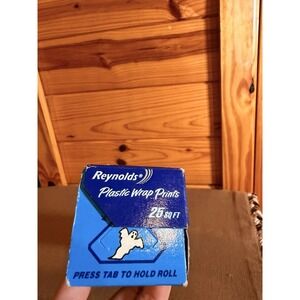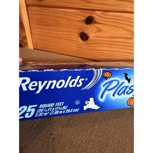 This product is a vintage Reynolds Plastic Wrap with spooky prints from 2001, offering 25 square feet of coverage. Made of durable plastic, this cling film is perfect for wrapping and storing food items in the kitchen. The unique spooky prints add a fun and themed touch to your kitchen storage and organization needs. With dimensions of 25 feet in length and 11.5 inches in width, this product is both practical and stylish for any home cook looking to add a touch of nostalgia to their kitchen supplies.