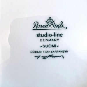 This is a white Rosenthal teapot in the undecorated Suomi shape, or Suomi White, made by Rosenthal of Germany. Suomi (which means "Finland" in Finnish) was designed by Timo Sarpaneva and first introduced in 1976. It is marked on the bottom "Rosenthal studio-linie GERMANY" and also has Sarpaneva's signature.