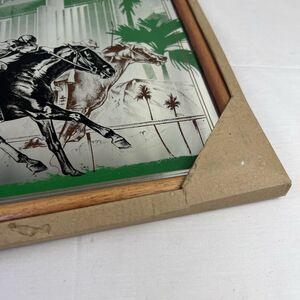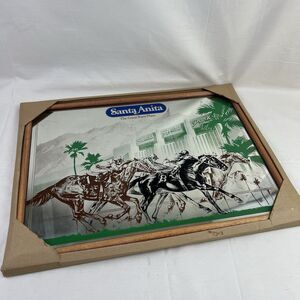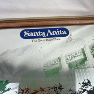 The product is a vintage Santa Anita horse racing wall advertising mirror featuring vibrant multi-color design. This one-of-a-kind mirror is a perfect collectible item for horse racing enthusiasts and fans of the sport. The mirror captures the essence of the great race place, making it a unique and eye-catching piece of fan apparel or souvenir.
