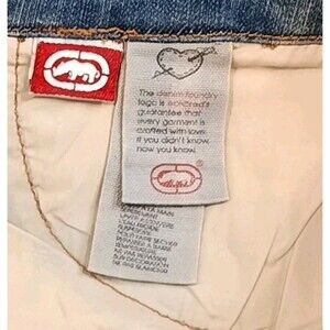 Vintage Y2K 90s Ecko Red Denim Blue Distressed Mini Skirt With Pockets Rivets Rhinestones Frayed Hem
