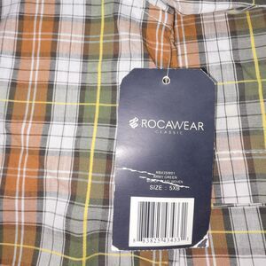 The Rocawear Button Shirt in size 5XL measurements in pictures, it is brand new with tags, classic men's casual button-down shirt featuring a collared neckline, short sleeves, and a spread collar style. Made from a blend of polyester and cotton, this lightweight shirt is perfect for summer, fall, and spring occasions like travel, casual outings, or workwear. The shirt showcases a vintage-inspired brown orange and blue plaid pattern, adding a colorful and retro touch to your wardrobe. With a regular fit and machine washable fabric, this Rocawear shirt is a stylish and versatile addition for any man's closet.