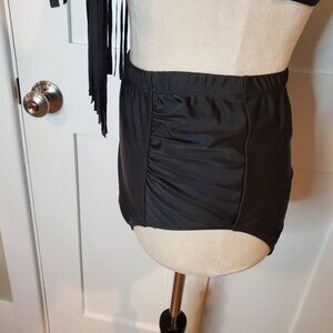 This black women's 2 piece swimsuit/ bathing suit has a fringed boho design. The top has underwires and is padded for support. It is a halter style which ties at the neck. The fringe is long, and hangs down below the waistline, creating a beautiful fringed look. The bottom has a high-cut leg and is high-waisted with ruching on the sides.