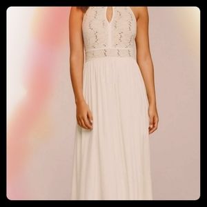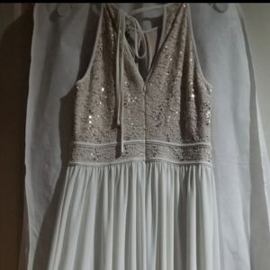 David's Bridal wedding dress. Gorgeous, lightweight, halter. Keyhole front and back. Gold glitter lace bodice. Only tried on and then I bought a different dress. Size 14 unaltered.