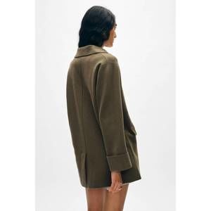 Oversized boyfriend fit, this jacket features tailored details like notch lapels, flap pockets, and a back vent. Relaxed fit. Long sleeve. Inseam length in size small is 30". The model is 5'8" and is wearing a size small. 80.5% Organic Cotton, 19.5% Elastane. Dry clean only.