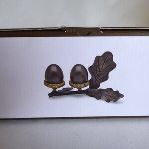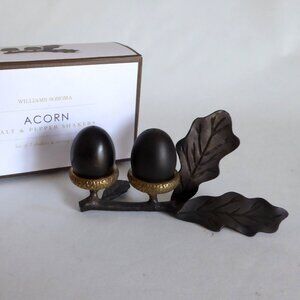 New in box, never used for their purpose, William Sonoma brand, Thanksgiving (Fall), antiqued brass, acorn with leaves and branch, salt and pepper shaker set. The acorn nuts (salt & pepper) are come off of its branch base. (See photos for details.) Items come from a pet and smoke free home.