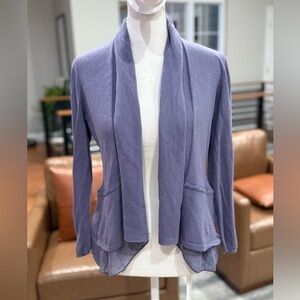 Elegant purple cardigan with open front. Features layered hem and pockets. Perfect for casual wear.
