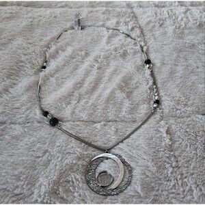 Chico's Moon Glow necklace has a silver-tone finish with a pendant featuring concentric circles and beaded accents.