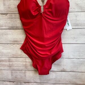 NEW WITH TAGS DKNY CABANA PLUNGE RING FRONT ONE PIECE SWIMSUIT IN RED
