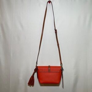 Description: New with tags/never worn Dooney & Bourke all leather crossbody saddle bag in color “Persimmon”. Gorgeous white stitching displays excellent craftsmanship and attention to detail. Comes with original dust bag and all accessories, including two removable leather tassels on the strap. Can be worn as a crossbody or shoulder bag! Comes with purse registration.