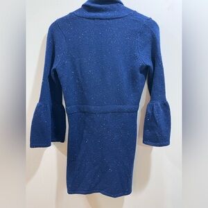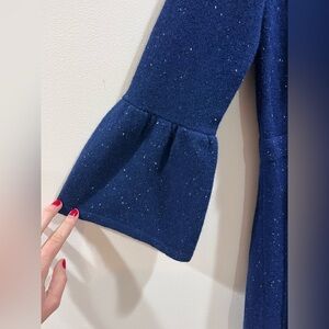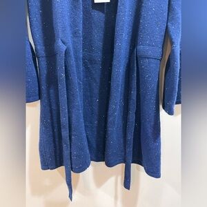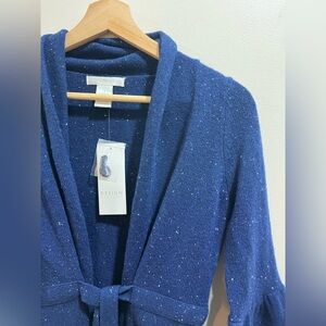 NWT Design History blue cardigan with white and green speckle pattern. Waist tie, 3/4 bell sleeves. 70% wool, 30% nylon. Size S.