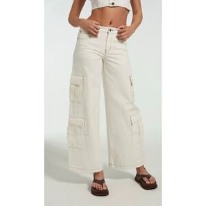 NEW WITH TAGS Milk It Jagged Combat Wide Leg Full-Length Cargo Denim Jeans Ivory Size 14 NWT