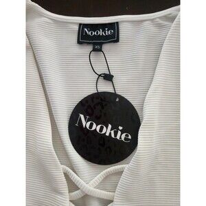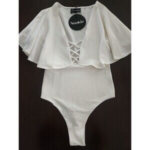 Nookie brand featured on REVOLVE. Whit bodysuit featuring a deep plunging v neck with criss cross details and short flutter sleeves. Size Extra Small.