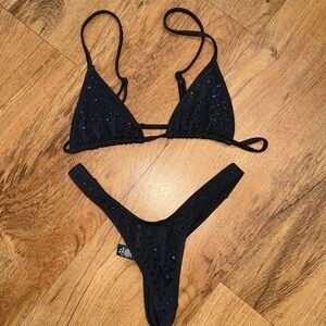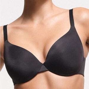 Upgrade your lounge wear collection with this brand new black Skims bralette, perfect for cozying up at home. The wireless design and blended fabric make it comfortable for all-day wear, while the racerback strap adds a stylish touch. The cut-out details give it a unique flair, making it the perfect addition to any wardrobe. This bralette is a size small and features a solid pattern, making it a versatile piece that can be paired with anything. Don't miss out on this must-have item - add it to your cart today!