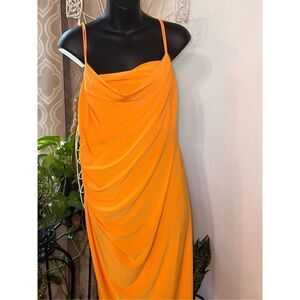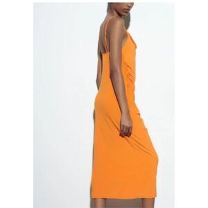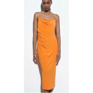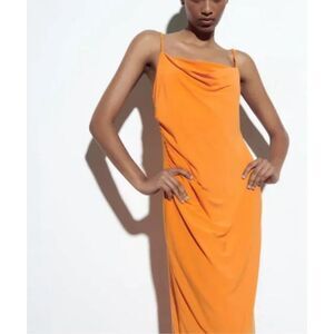 NEW WITH TAGS Zara Flowy Strappy Dress, Midi Slip Dress With Draped Neckline Orange Size LARGE