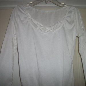 THIS IS SUCH A PRETTY PIECE. WE THINK IT IS A SOFT SYNTHETIC BLEND IT MIGHT HAVE A DROP OF COTTON. THE CORSET STY IS THE PRE MADE LACEING ON THE NECKLINE SO SEXY. FROM UNDERARM TO UNDERARM ALL THE WAY AROUND THE PIECE IS 34 INCHES. ENJOY PRETTY THINGS. 2ND GROUP. THANKS