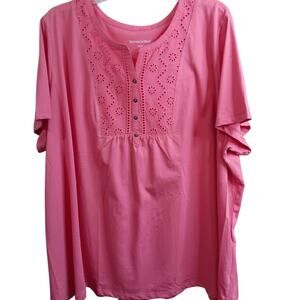 This Woman Within top is perfect for casual wear. The softness, pink color and eyelet inset add a touch of femininity. It has short sleeves for comfort and is in new condition.