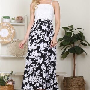 Get ready to catch a beautiful sunny spring day that comes with that gentle wind in this gorgeous on trend black and white floral spaghetti strap flowy midi maxi dress!