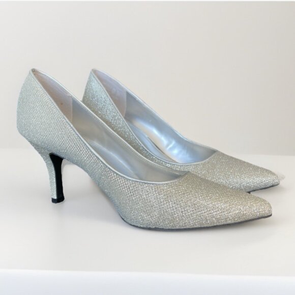 These size 8.5 women's silver sparkle Fioni Night high heel shoes are perfect for special occasions like weddings, parties, or formal events. Featuring a pointed toe and slip-on closure, the pumps have a heel with a 3.25-inch platform height for added style and comfort. The fabric upper material and silver color give off a glamorous metal theme, making them a chic and elegant choice for any fashionable woman. C125218
