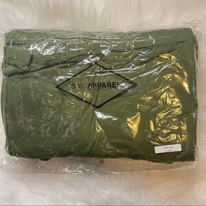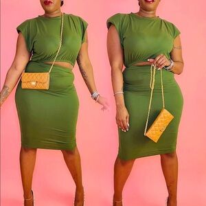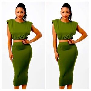 NEW WOMEN’S TRENDY OLIVE 2 PIECE CROP TOP SHOULDER PAD SHIRT MIDI CALF SKIRT SET