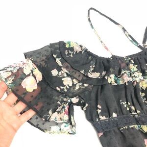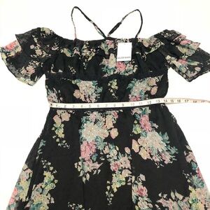Brand new with tags. Hansen cold-shoulder floral-print fil coupé georgette dress, this print is called Summer Night Floral. So much gorgeous detail, from the lace under the bust and at waist, the slight sheen of the floaty fabric, and the simple bow at the back. hem comes down lower at sides. Colors include black with grey, green, pink, and more. Square textured chiffon material. Ruffle accents. Adjustable spaghetti straps. Elastic waistline. Sharkbite/asymmetrical hemline. 100% Polyester. Lined