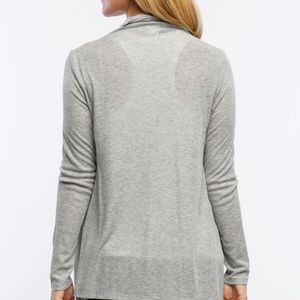 This cardigan is open with waterfall style bottom. It is a long sleeved and is longer in the front.