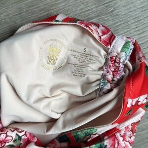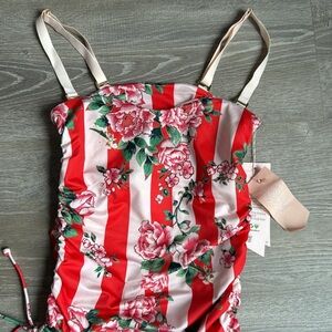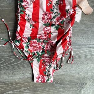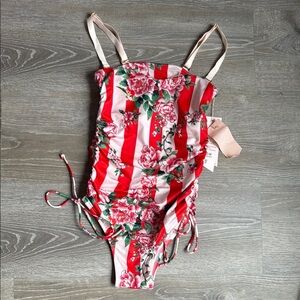 NEW We Are HaH One Piece Swimsuit Red Floral Stripe Ruched Snalll