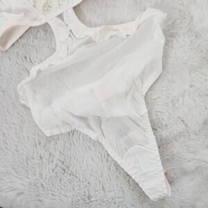 So sweet, vintage-inspired bodysuit featured in a sheer mesh fabrication with delicate lace detailing and feminine ruffle trim.