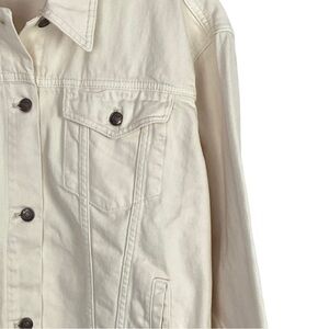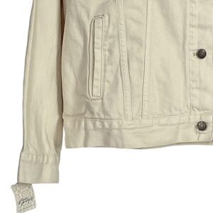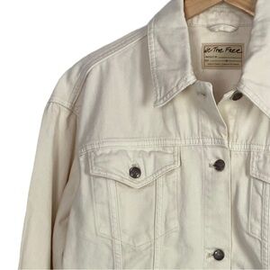 We the Free Jolene Trucker Denim Jacket in Ecru with front button closure, buttoned cuffs and waist tabs at hem, and breast flap pockets with button closure. Machine wash. Please see pictures for more details and measurements.