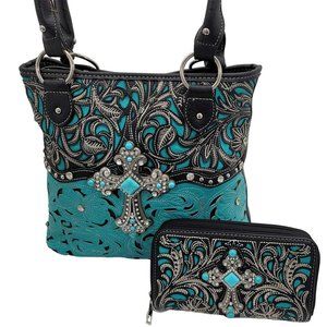 Western Style Concealed Carry Turquoise Stone Cross Shoulder Bag Purse and Wallet Set