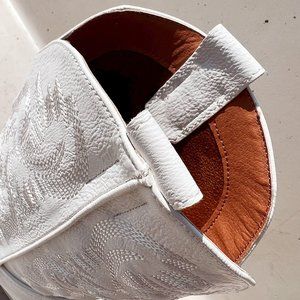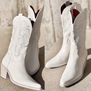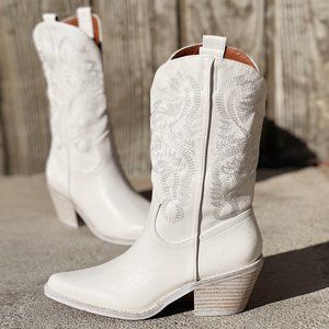 NEW White Cowboy Western Embroidered Stitch Pointy Toe Block Heel Mid Calf Boots
