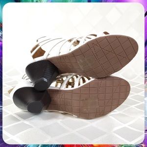 💐Reasonable Offers Accepted!💐 Gorgeous bright white faux leather gladiator sandals accented with gold-tone metal rings in the front. Open toe. Low 2.75" block heel. Skid-resistant rubber outsole. Zips at the heel. Available in Sizes 7.5M and 8M. These shoes are Brand New and come in their original box. See pics!