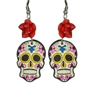 Each earring is topped with a striking red flower, adding a touch of elegance and contrast to the vibrant skull design. Lightweight and comfortable, these earrings are perfect for all-day wear, making them an excellent choice for both casual outings and special occasions. Embrace the festive and symbolic nature of these earrings, and let them add a splash of color and culture to your jewelry collection.