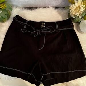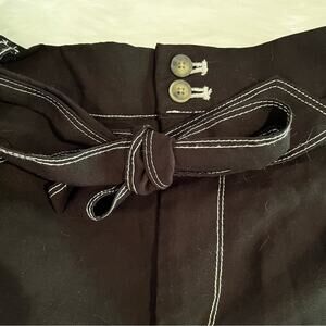 New Belted Paper Bag Ruffle Flutter Rayon Shorts. Black with Contrasting White Stitching. Double Button and Zipper Closure. Removable and Adjustable Belt. Rayon and Polyester. Size XL.