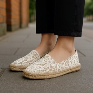 A cute, comfortable and stylish choice for spring and summer - espadrille flats by the Wild Pair. These slip on shoes are made of lace covered sturdy cotton fabric, size 6 in White. Round toe. Padded insole. Non slip soles. Great to wear to and casual occasion: the beach, pool, lake or festivals! New, in box.