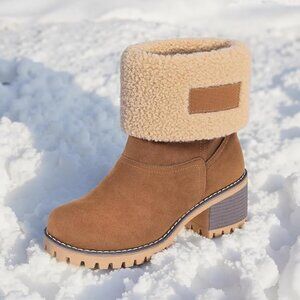 NEW Winter Snow Boots for Women, Comfortable Slip On Mid Chunky Heel Suede Warm