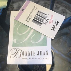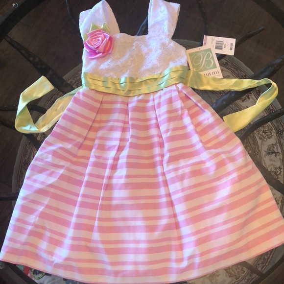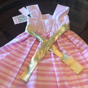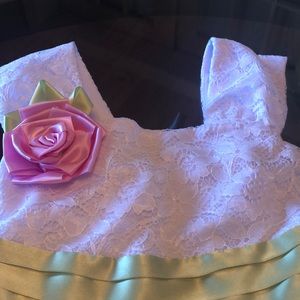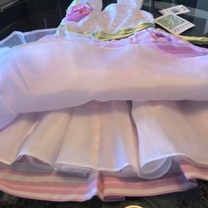 Brand NEW with tags so my loss is your gain! Lovely pink and white dress accented by the perfect shade of green. Waist tie and fully lined is this lace top and pink and white bottom with tulle for added volume. It comes from a single child non smoking home and ready to take hone today!