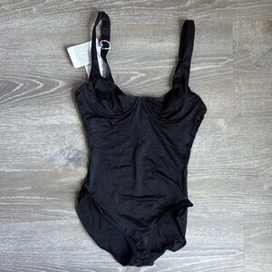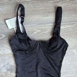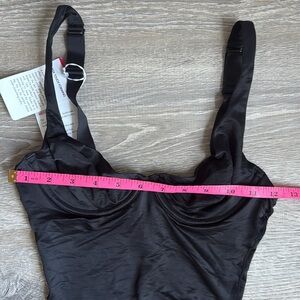 Shelf bra-style sides at top for additional smoothing and support, with covered elastic at top and underband at bottom.