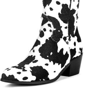 FEATURE: Upgrade Material, Soft horse hair will not hurt your skin. block mid heel western boots with cow print are designed to help you stand out, sturdy stacked chunky low heel cow boots, keep your cozy and trendy.