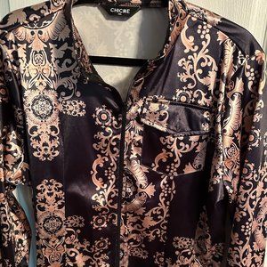 NEW Women SZ 1X 2X All Over Print Deep V Neck Zipper Front Top Zip Jacket CHIC!