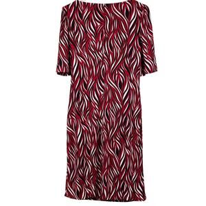 Step out in effortless elegance with this Black Label by Evan-Picone short sleeve midi wrap dress in size 6. Featuring a striking red, black, and white abstract print with red as the standout color, this dress offers a bold yet sophisticated look perfect for work, events, or evenings out.