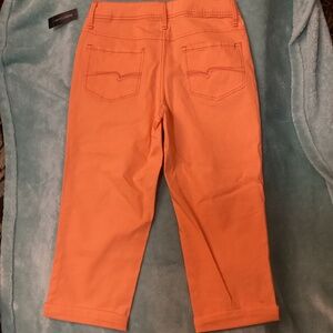 These are BRAND NEW, WITH TAG, NEVER WORN. Nice orange color. Has a rolled up cuff that could be worn rolled or unrolled, your choice. Very stylish. Great for Spring, Summer or Fall. If you live in a warmer state, these would be great for Winter too. They are 98% Cotton, 2% Spandex. Don’t pass these up! Check out my other NWT capris. Bundle and save on Shipping (when the weight is under 5 pounds).