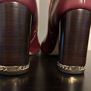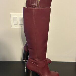 You are Looking at a Pair of Womens MICHAEL KORS Walker Leather Boots in a Size 8.5. Burgundy in color with a Leather Upper and Rubber Outsole. Has a Stacked Heel and Chain Link Hardware. Knee High with Side Zipper Closure.